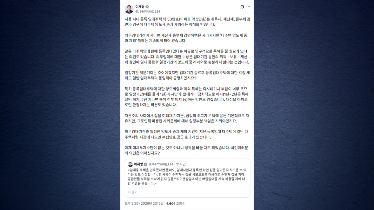이 대통령은 오늘(9일) SNS에, 같은 다주택인데 한때 등록임대였다는 이유로 영구적인 특혜를 줄 필요가 있느냐는 의견도 있다며 이같이 밝혔습니다.