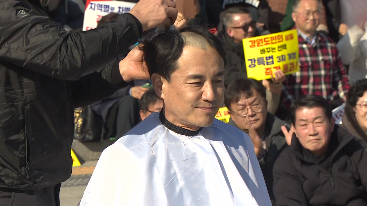 국회의사당 앞 계단을 꽉 채운 도민들 앞에서, 김진태 강원지사가 흰 천을 두르고 삭발을 감행합니다.