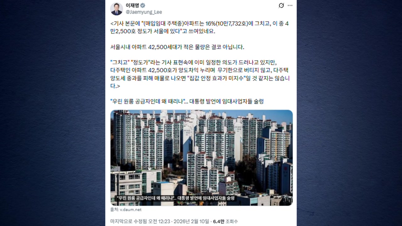 이 대통령은 오늘(10일) SNS에, 현재 집값 상승세 진원지는 아파트인데, 정작 임대사업자는 다가구주택과 오피스텔 등을 매입한 경우가 적지 않단 취지의 기사를 공유하며 이같이 적었습니다.