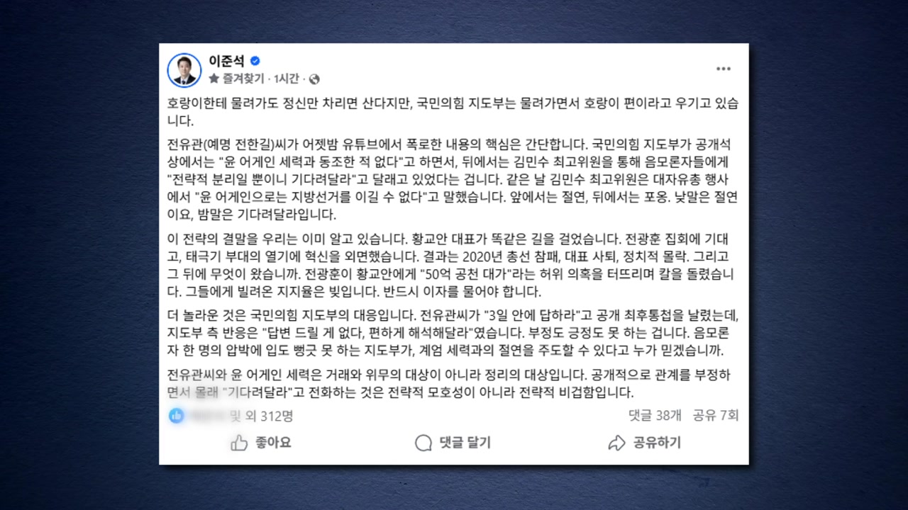 유튜버 전한길 씨가 국민의힘 지도부로부터 ’윤 어게인 단절은 전략적인 선택’이라는 취지의 말을 전해 들었다고 주장하자, 개혁신당 이준석 대표가 비판에 나섰습니다.