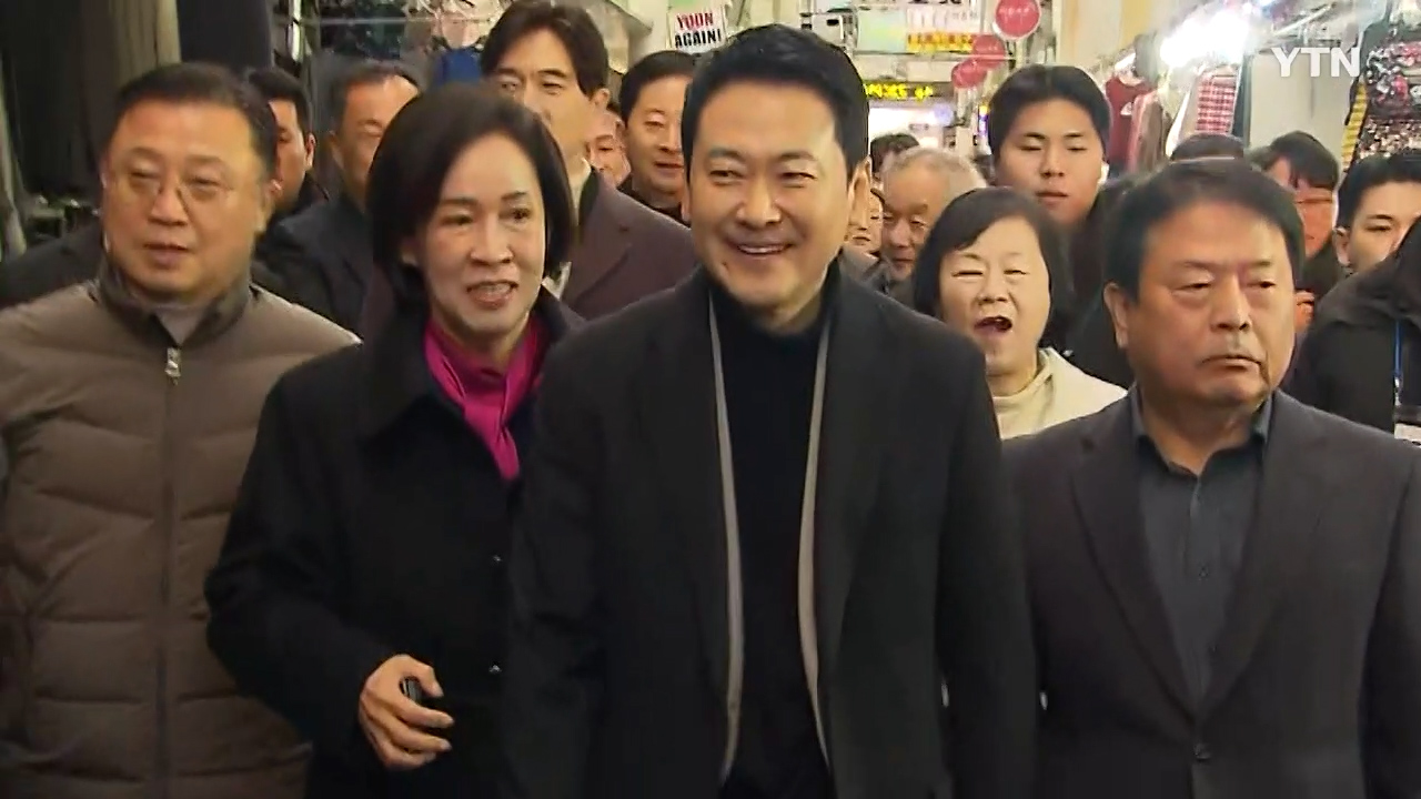 상인과 시민의 환영을 받으며 시장 거리를 이동하는 장동혁 대표의 등 뒤로 커다란 구호가 우렁차게 들려왔다.