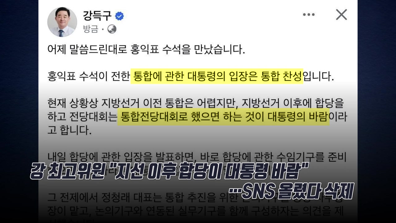 어젯밤 민주당 긴급 최고위원회의가 열리기 전, 강 최고위원은 ’지방선거 이후에 합당하는 것이 대통령 바람’이라는 내용의 글을 SNS에 올렸다가 2분 만에 빠르게 삭제했습니다.