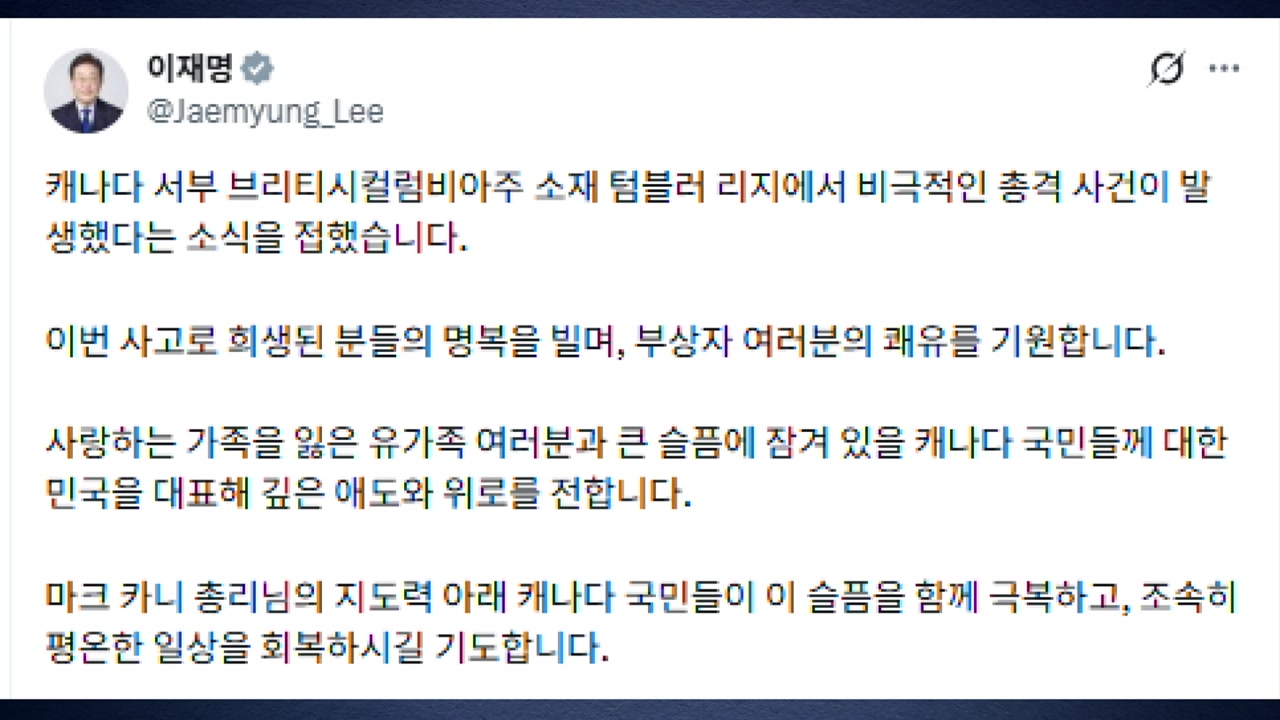 이어 마크 카니 총리의 지도력 아래 캐나다 국민이 슬픔을 함께 극복하고, 조속히 평온한 일상을 회복하시길 기도한다고 덧붙였습니다.