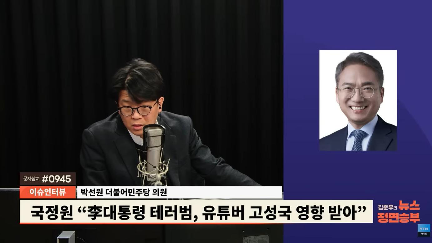 ◇ 박선원 : 이 건에 대해서는요, 가덕도 테러 조사 수사 TF가 구성이 돼 있습니다. 국가수사본부가 중심이 되어 있고, 그리고 이거는 테러방지법에 해당이 되기 때문에 국가정보원에서 이 테러로 지정된 사건에 대해서는 수사 및 조사할 수 있는 권한이 있습니다. 그래서 국가정보원도 별도의 가덕도 TF를 만들어서 국수본과 협조하면서 자체 조사를 하고 있습니다. 그 과정에서 나온 사실이지요. 첫 번째로는 테러범이 당시 범행 직전에 극우 유튜버 고성국 TV 고성국과 수차례 통화를 했다라고 하는 게 첫째고요. 두 번째는 이 테러범 김진성이라고 되어 있는 테러범이 고성국 TV를 방문한 사실, 두 가지가 확인이 됐습니다. 그런데 이 김진성이라는 사람은 추가로 오늘 또 한 가지 제가 질문 과정에서 밝혀낸 것은 해병대 출신의 군 경력을 갖고 있고요. 이 사람이 아산시 배방면에서 부동산업을 하고 있었잖아요. 부동산업을 하면서 태극기 부대 등 극우 단체 집회에 거의 매주 서울에 올라와서 참석을 했었어요. 아산시에 있는 다른 사람하고 같이. 그러면서 일반적으로 극우 유튜버에 영향을 받았다라고 하는 것을 추정할 수가 있었는데 오늘 확인이 된 것은 여러 극우 유튜브가 있잖아요. 그 유튜버들 사이에 고성국의 영향을 받은 게 거의 확인됐다 하는 거죠.