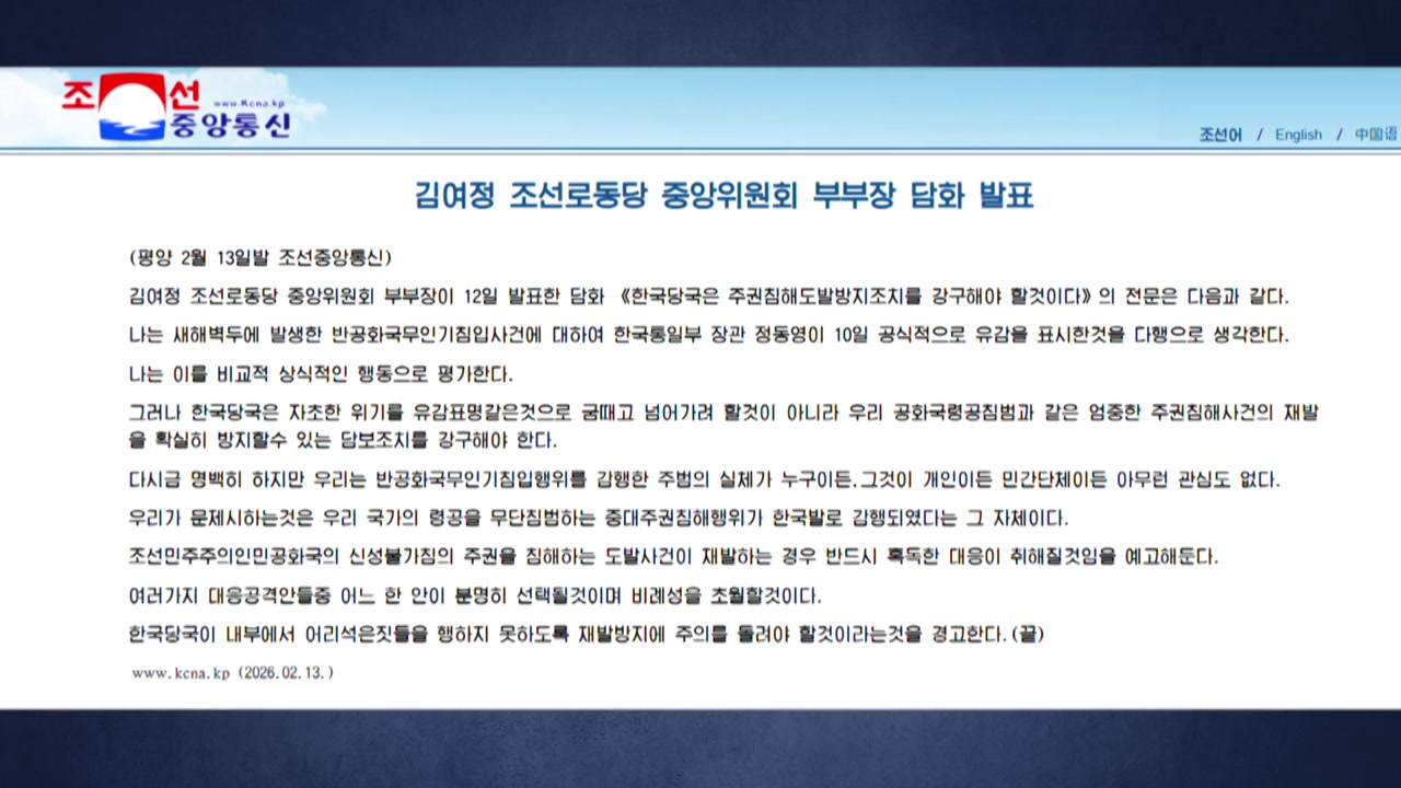 김 부부장은 어제(12일) 담화에서 반공화국 무인기 침입사건에 대해 한국 통일부 장관 정동영이 공식적으로 유감을 표시한 것을 다행으로 생각한다며 이같이 밝힌 내용을 조선중앙통신이 보도했습니다.