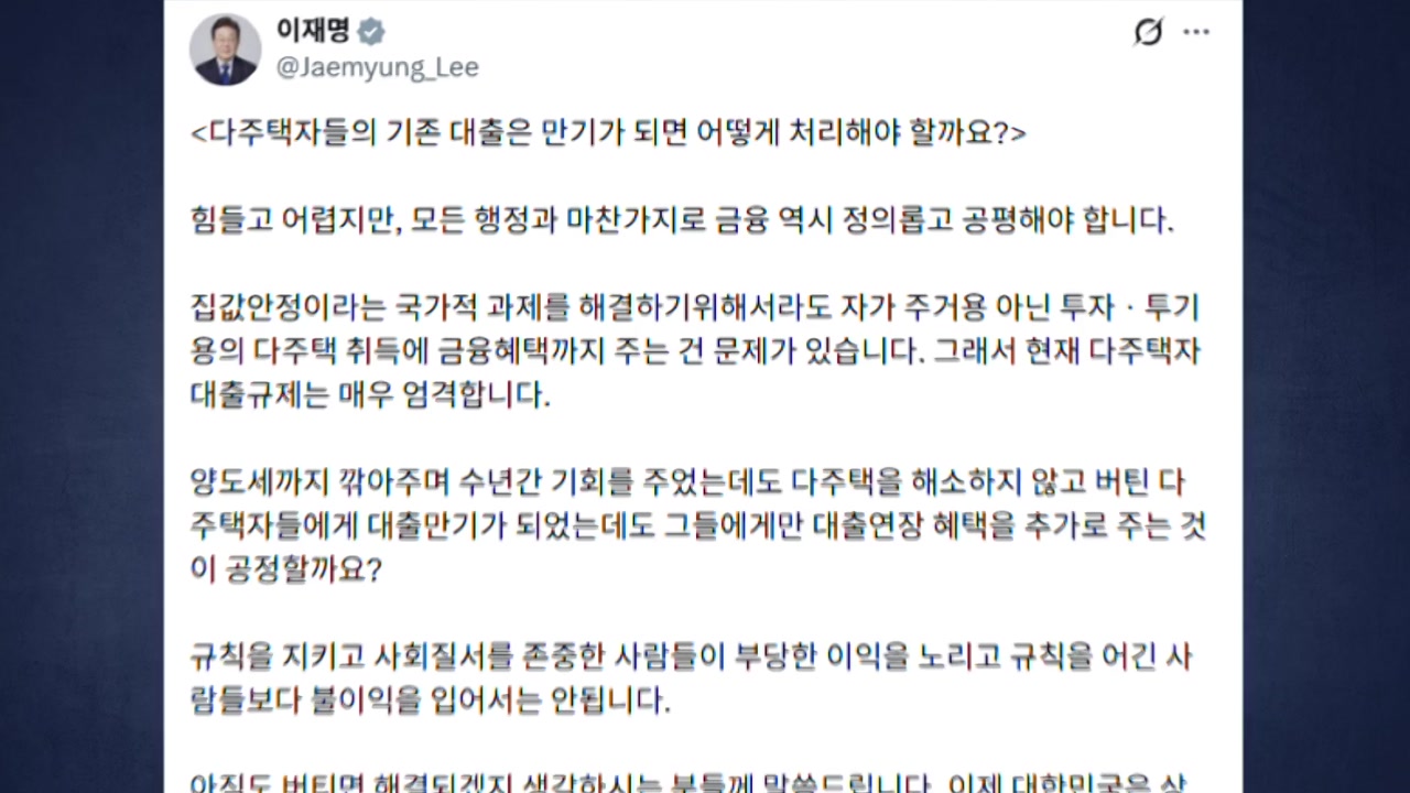 이 대통령은 오늘(13일) SNS에, '다주택자들의 기존 대출은 만기가 되면 어떻게 처리해야 할까요?'라는 제목의 글을 올리고, 이같이 적었습니다.