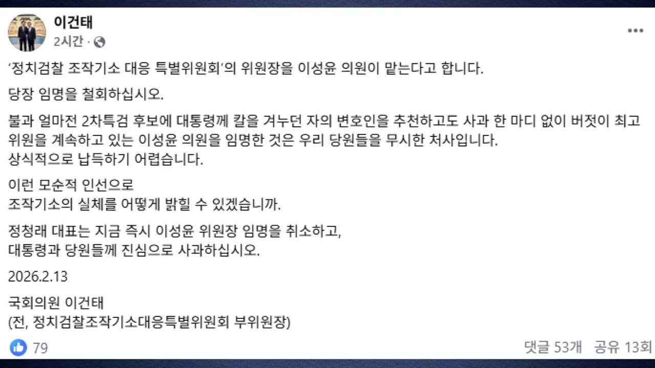 이건태 의원은 오늘(13일) SNS에 2차 종합특검 후보에 대통령을 향해 칼을 겨누던 자의 변호인을 추천하고도 사과 한마디 없는 이성윤 최고위원을 위원장에 임명한 건 당원을 무시한 처사라고 비판했습니다.