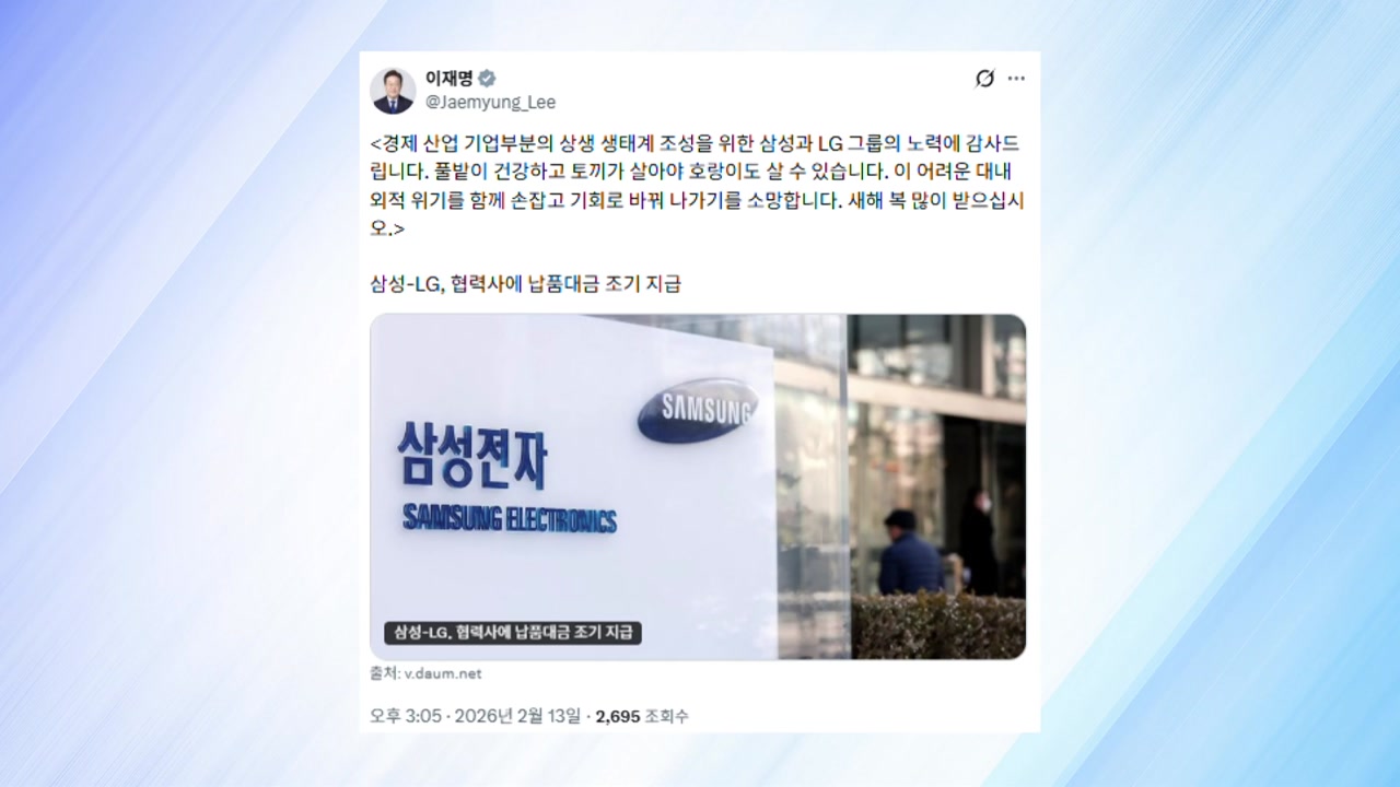 이 대통령은 어제(13일) SNS에, 삼성그룹과 LG그룹이 협력사에 납품 대금을 조기에 지급하기로 했다는 내용의 기사를 공유하면서 이같이 적었습니다.
