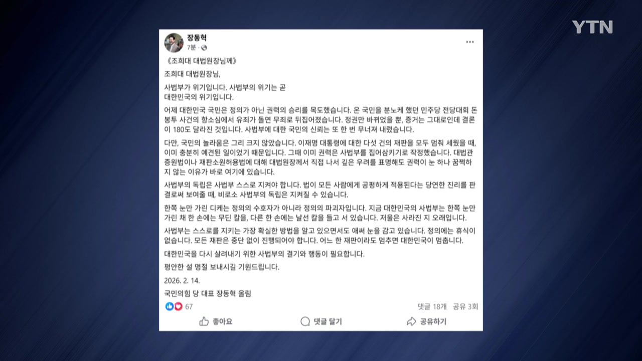 장 대표는 오늘(14일) 자신의 SNS에, 사법부는 스스로를 지키는 가장 확실한 방법을 알고 있으면서도 애써 눈을 감고 있다며 이같이 적었습니다.