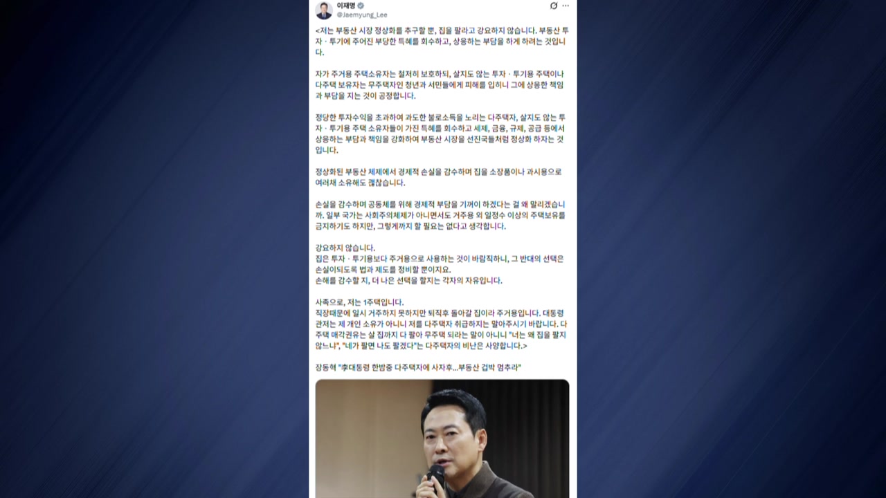 이 대통령은 또 자신은 1주택이라며, 대통령 관저는 개인 소유가 아니니 다주택자 취급하지는 말아 달라고 덧붙였습니다.