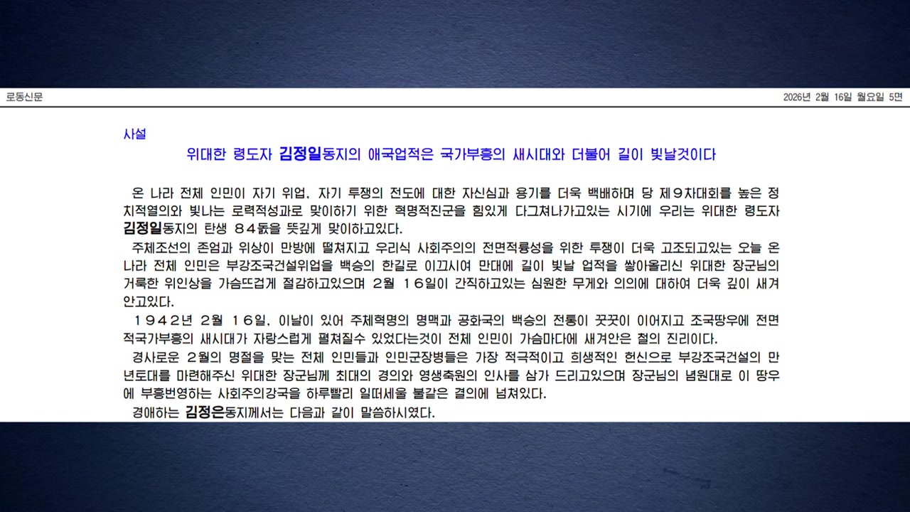 북한은 김정일 국방위원장의 84번째 생일을 맞아 일심단결을 강조하며, 김정은 국무위원장에 대한 충성을 주문했습니다.