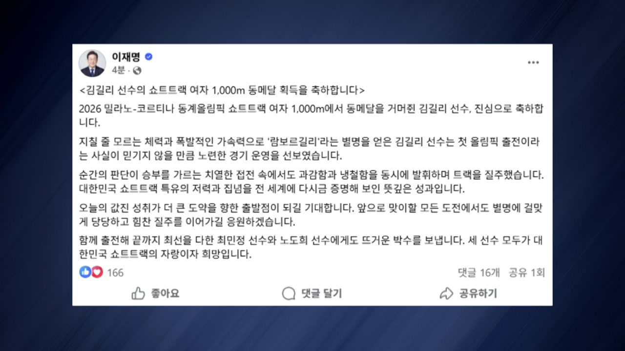 이 대통령은 어제(16일) SNS에 지칠 줄 모르는 체력과 폭발적인 가속력으로 '람보르길리'란 별명을 가진 김길리 선수가 첫 올림픽 출전이란 사실이 믿기지 않을 만큼 노련한 경기 운영을 선보였다며 이같이 적었습니다.