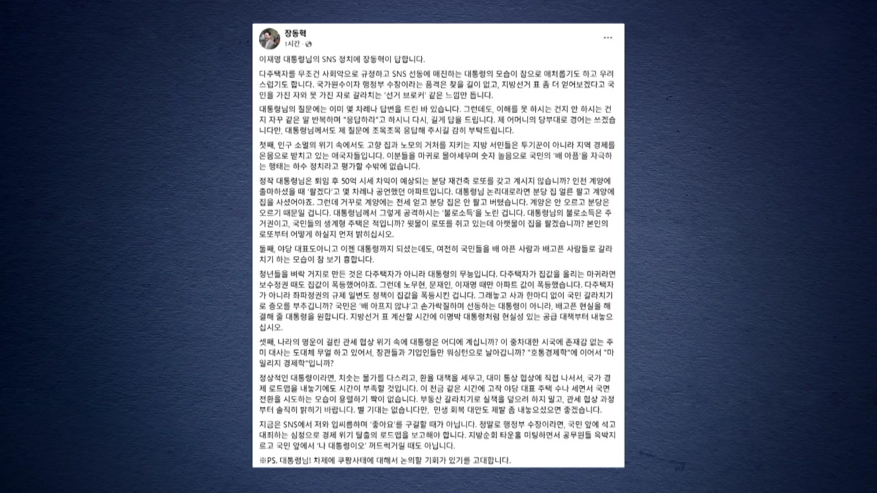 장 대표는 어제도 이 대통령과 다주택자 정책을 두고 '장외 설전'을 벌였습니다.
