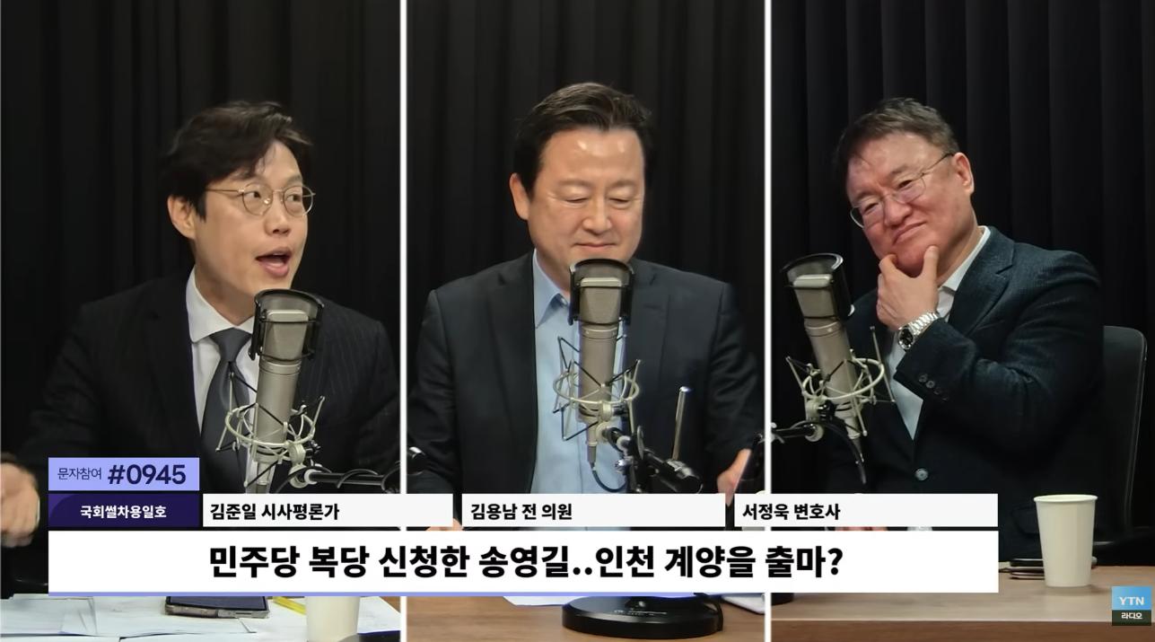 ◈김준일: 주소를 옮겼다고 해요. 그리고 이 2심 무죄 나오기 전부터 여러 정치인들이나 기자들 만나면은 “야 그 계양하면 그거 내 거야”, “난 출마할 거야” 그런 얘기를 하고 다녔어요. 근데 무죄까지 되고, 복당까지 하면은 본인은 출마를 안 할 이유가 없는 거죠. 그러니까 출마를 해서, 다른 걸 얻어내더라도 무조건 출마는 해야 되는 상황이에요. 그래서 출마는 무조건 할 거라고 보고, 김남준 대변인이 인천 계양을에 출마할 거라는 얘기가 있었잖아요? 그러니까 교통 정리가 필요해요. 근데 지금 박찬대 의원이 인천시장 출마가 유력합니다. 그러면 인천 연수가 나오게 돼 있어요. 그래서 이 교통 정리를 어떻게 할 것이냐, 그러면은 다른 변수를 제외하고 김남준, 송영길 두 사람만 하면은 송영길 계양을 김남준 연수. 이렇게 갈 것이냐