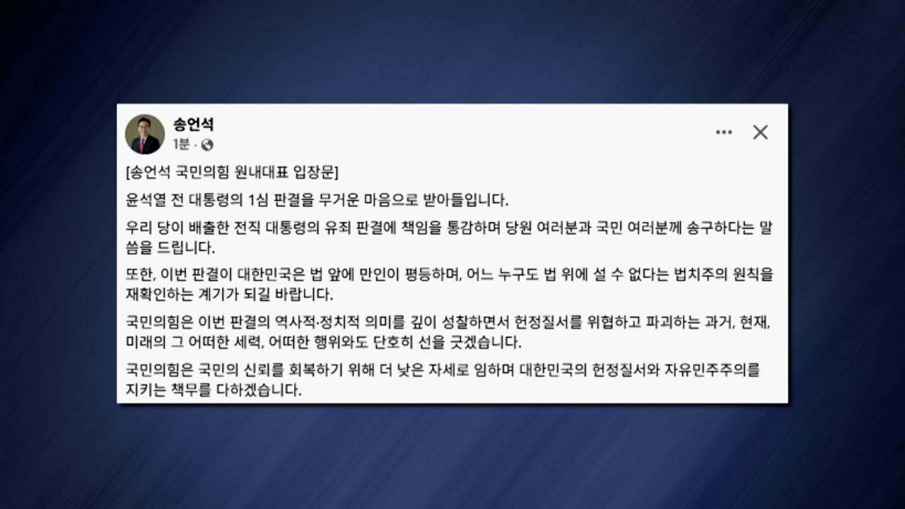 국민의힘 송언석 원내대표는 윤석열 전 대통령이 내란 우두머리 혐의 재판 1심에서 무기징역을 선고받은 것과 관련해 당이 배출한 대통령의 유죄 판결에 책임을 통감하고 당원과 국민께 송구하다는 입장을 발표했습니다.