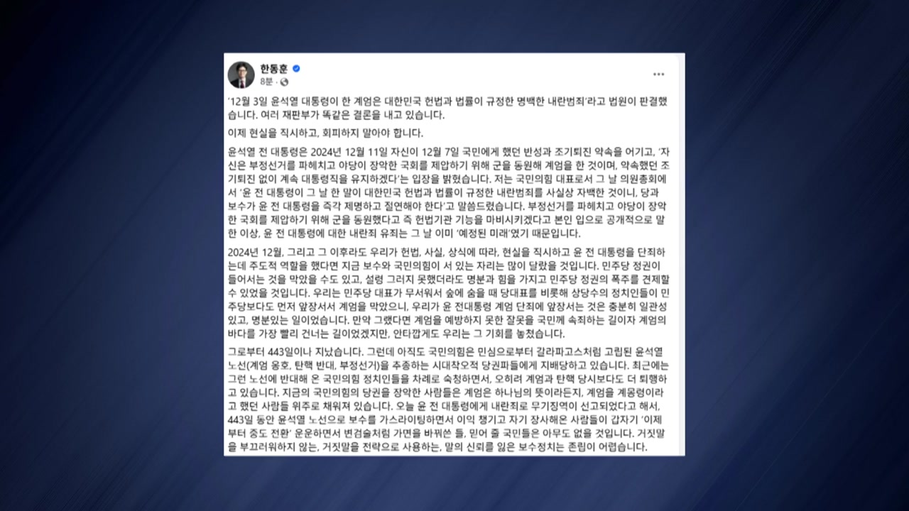 한 전 대표는 어제(19일) 자신의 SNS에, 443일 동안 자기 장사를 해온 사람들이 윤 전 대통령 1심 선고를 계기로 '중도 전환'을 운운하며 가면을 바꿔쓴들 믿어 줄 국민은 아무도 없을 거라며 이같이 적었습니다.