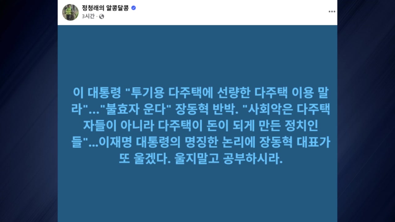 정청래 대표는 어제(19일) SNS에 이 대통령의 '사회악은 다주택자들이 아니라 다주택이 돈이 되게 만든 정치인들'이라는 게시글을 언급하며 장 대표가 또 울겠다면서, 울지 말고 공부하라고 직격했습니다.