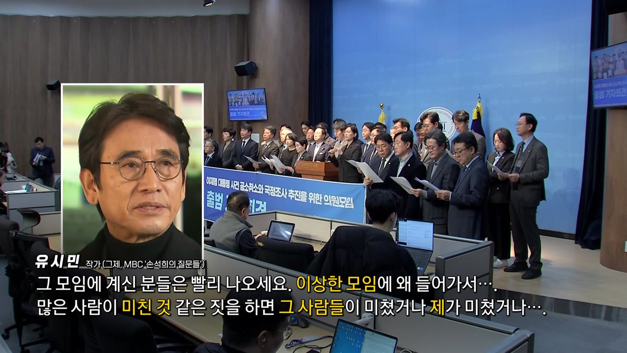 [유시민 / 작가 (그제, MBC '손석희의 질문들') : 그 모임에 계신 분들은 빨리 나오세요. 이상한 모임에 왜 들어가서…. 많은 사람이 미친 것 같은 짓을 하면 그 사람들이 미쳤거나 제가 미쳤거나…. 둘 다 미쳤을 수도 있지만, 제가 미친 것 같지는 않아요.]