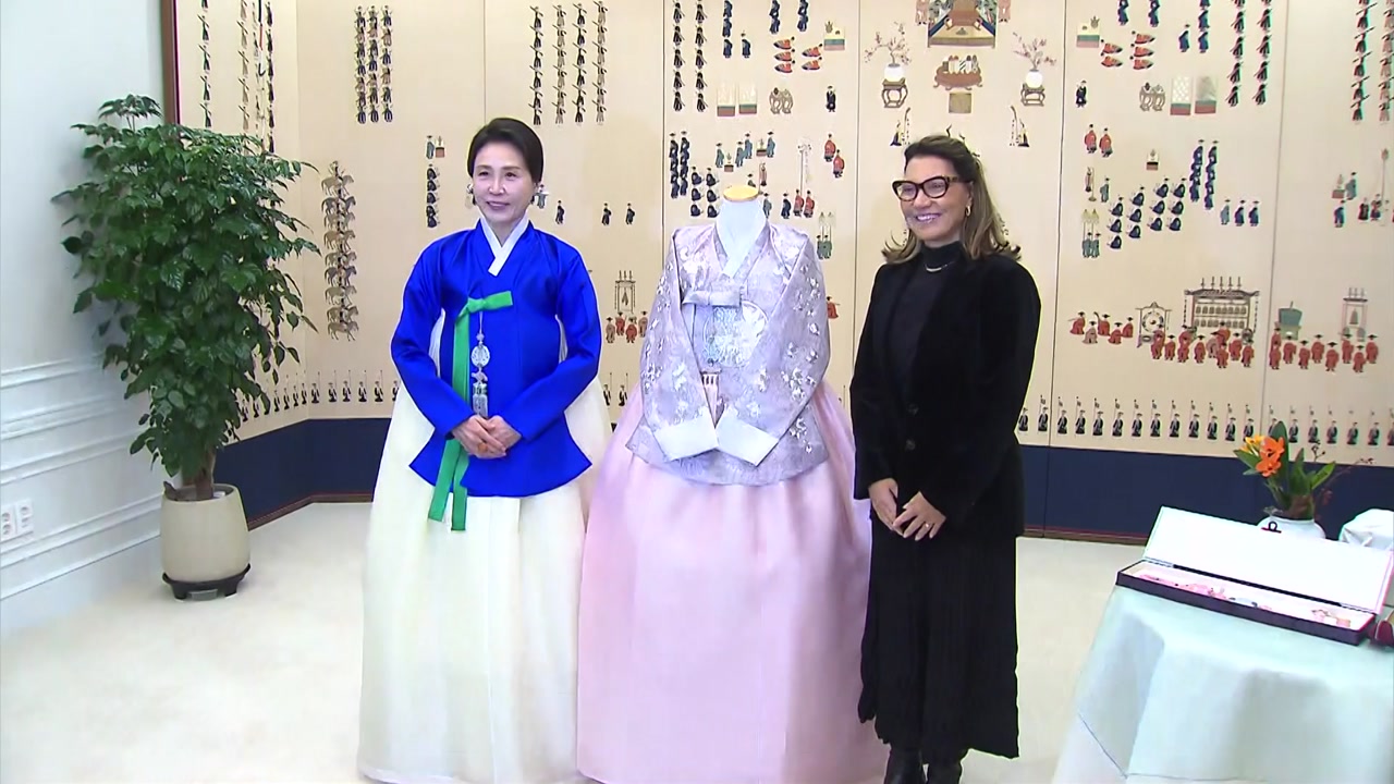 김 여사는 오늘(23일) 오전 청와대를 찾은 잔자 여사에게 지난 21일 함께 맞춘 한복을 선물하며 함께 기념사진을 촬영했습니다.