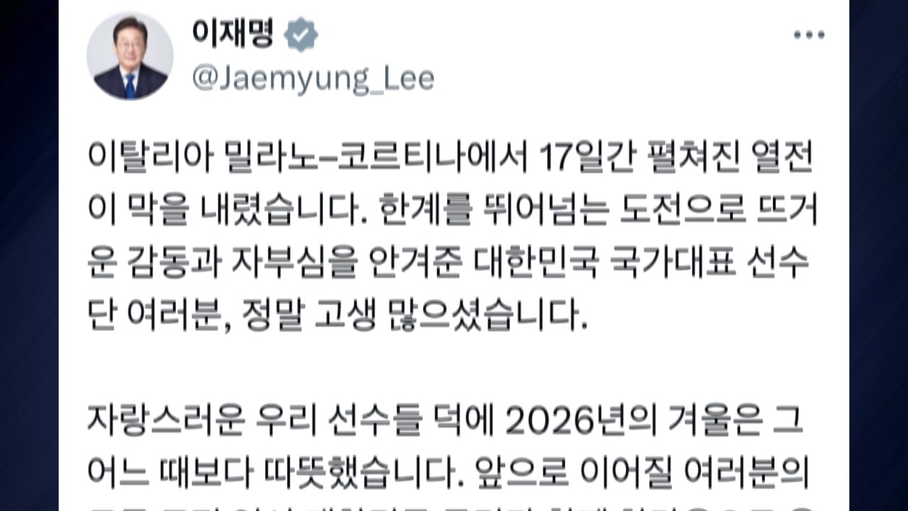 이 대통령은 어제(23일) SNS에, 자랑스러운 우리 선수들 덕에 2026년의 겨울은 그 어느 때보다 따뜻했다며 이같이 적었습니다.