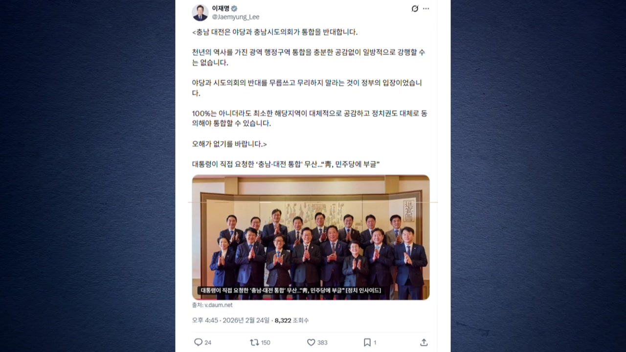 이 대통령은 오늘(24일) 충남·대전 통합법이 국회 법제사법위원회에서 보류된 뒤, SNS에 오해가 없기를 바란다며 이같이 적었습니다.