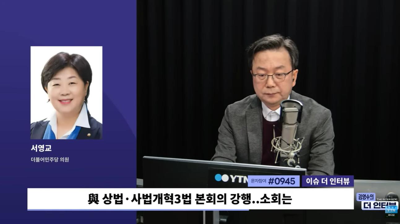 ◇김영수: 오늘 <더 인터뷰> 1부의 문을 열어주실 분은 더불어민주당 서영교 의원입니다. 서울 중랑 갑이 지역구입니다. 서 의원은 19대부터 20대, 21대 22대까지 내리 4번 당선된 4선 중진 의원입니다. 국회 법사위원으로 내란 척결 사법개혁 완수의 목소리를 높이고 있습니다. 전화로 연결합니다. 의원님 나와 계시죠?