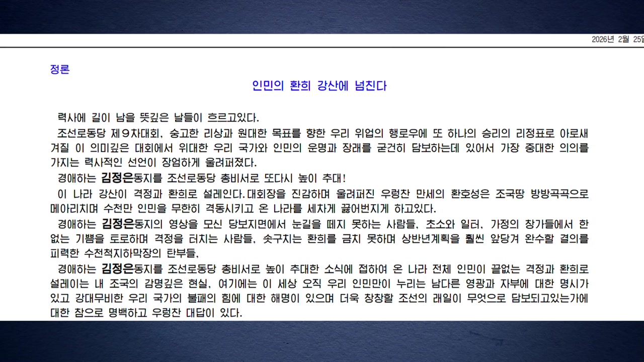 신문은 오늘 김 위원장의 총비서 재추대로 온 나라 전체 인민이 끝없는 걱정과 환희로 설렌다며 이같이 보도했습니다.