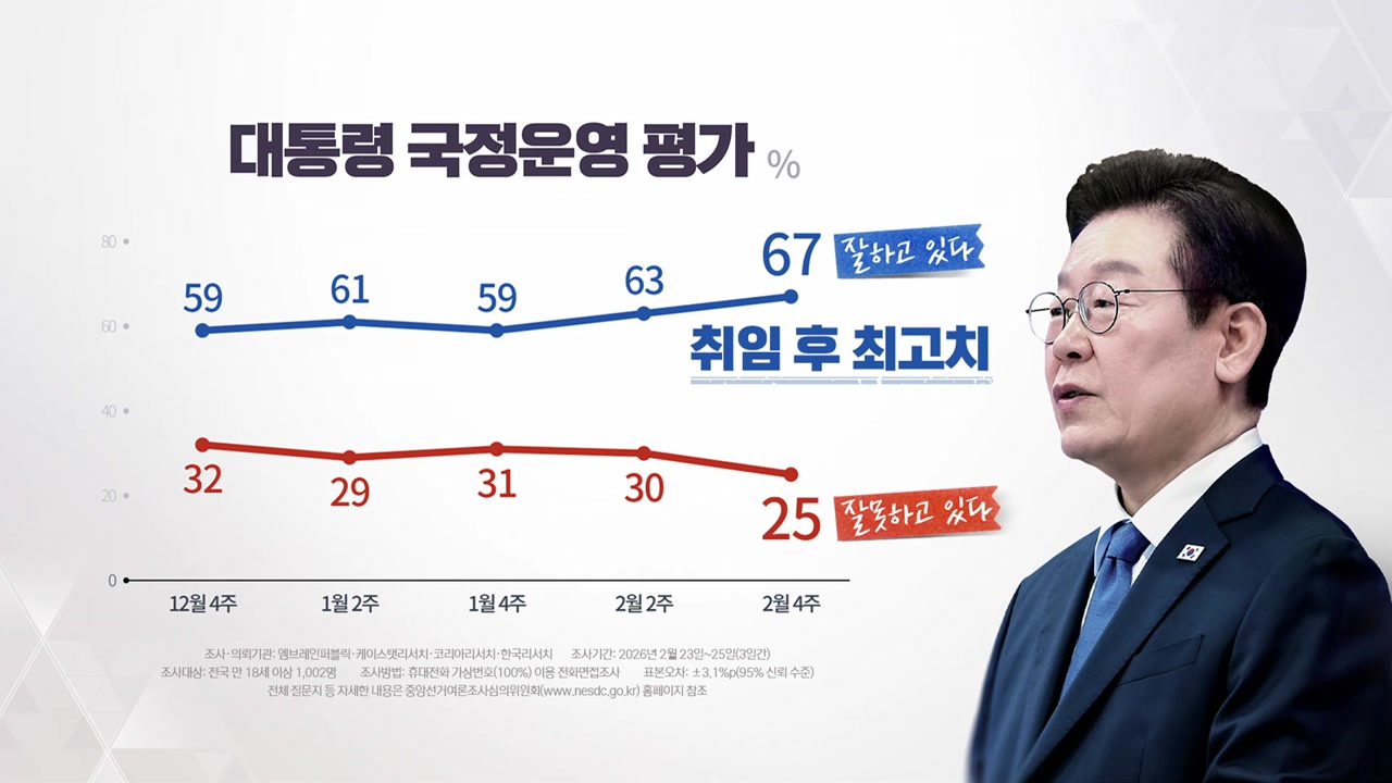 엠브레인퍼블릭과 케이스탯리서치, 코리아리서치와 한국리서치가 지난 23∼25일 성인 천2명을 대상으로 전국지표조사(NBS)를 한 결과, 이 대통령 국정 운영을 긍정 평가한 응답자는 67%로, 직전 조사인 2주 전보다 4%포인트 올랐습니다.