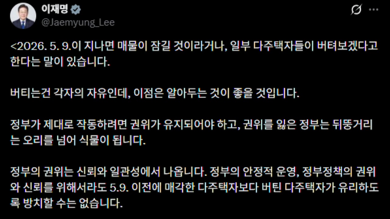 이 대통령은 어젯밤(26일) SNS에, 5월 9일이 지나면 매물이 잠길 거라거나, 일부 다주택자들이 버텨보겠다는 말이 있다고 적었습니다.