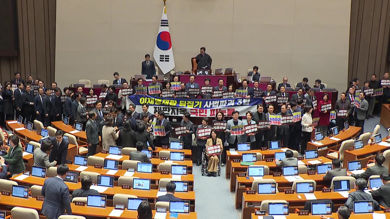 국민의힘은 어제(27일) 재판소원법에 대한 무제한 토론 종결 표결이 진행되는 동안 본회의장 의장석을 포위했는데, 이 과정에서 영상을 찍던 이해민 의원과 서 의원 사이 충돌이 빚어졌습니다.