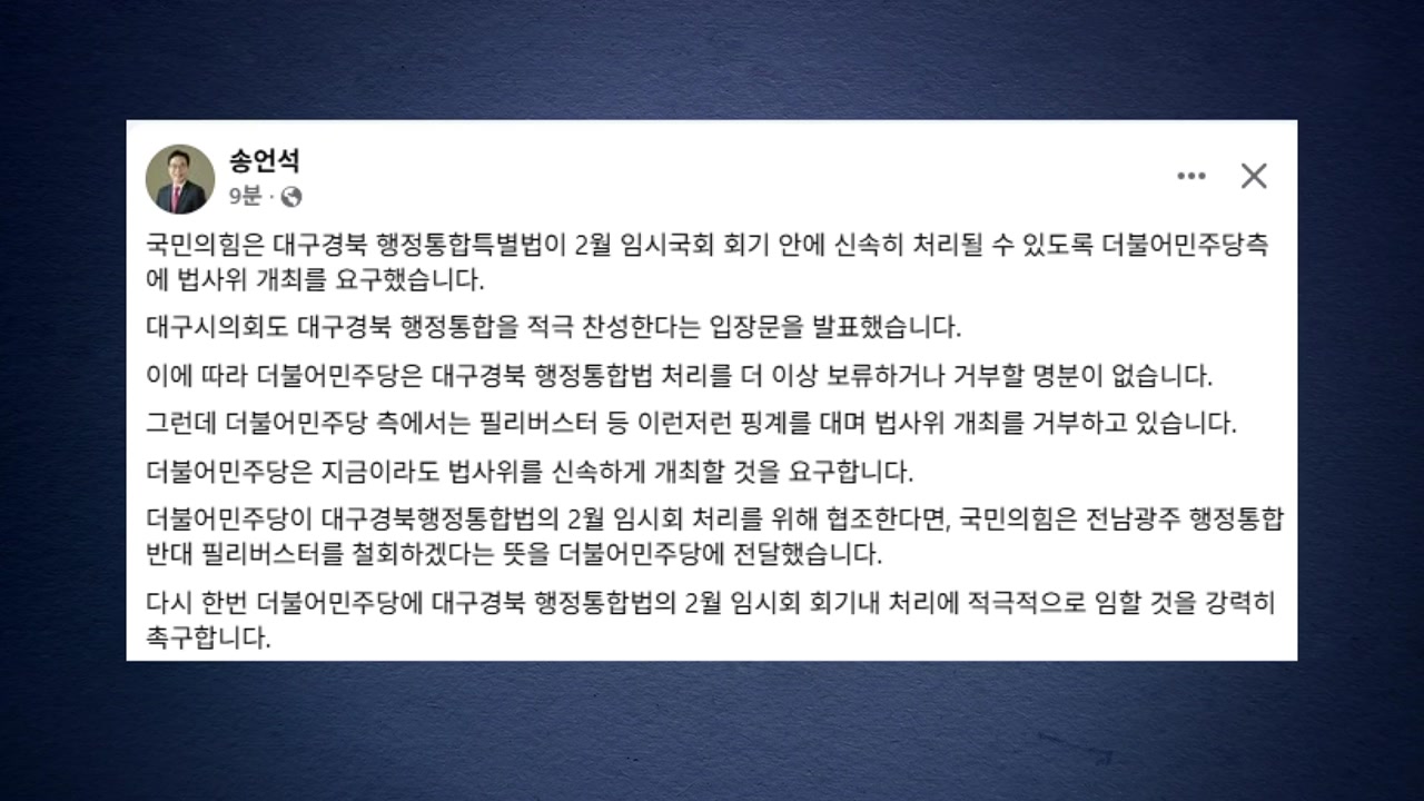 송언석 원내대표는 어제(28일) 자신의 SNS에, 민주당은 대구·경북 통합법 처리를 보류하거나 거부할 명분이 없다고 적었습니다.