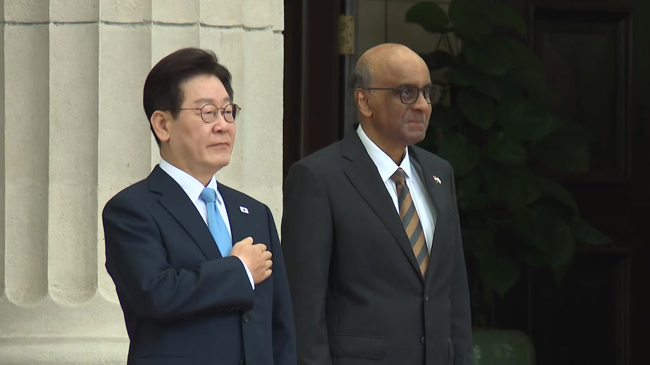 이재명 대통령, 우리 시각으로 오늘 오전 싱가포르 정부 청사에서 타르만 샨무가 라트남 대통령 부부와 함께 공식 환영식에 참석하고 있습니다.