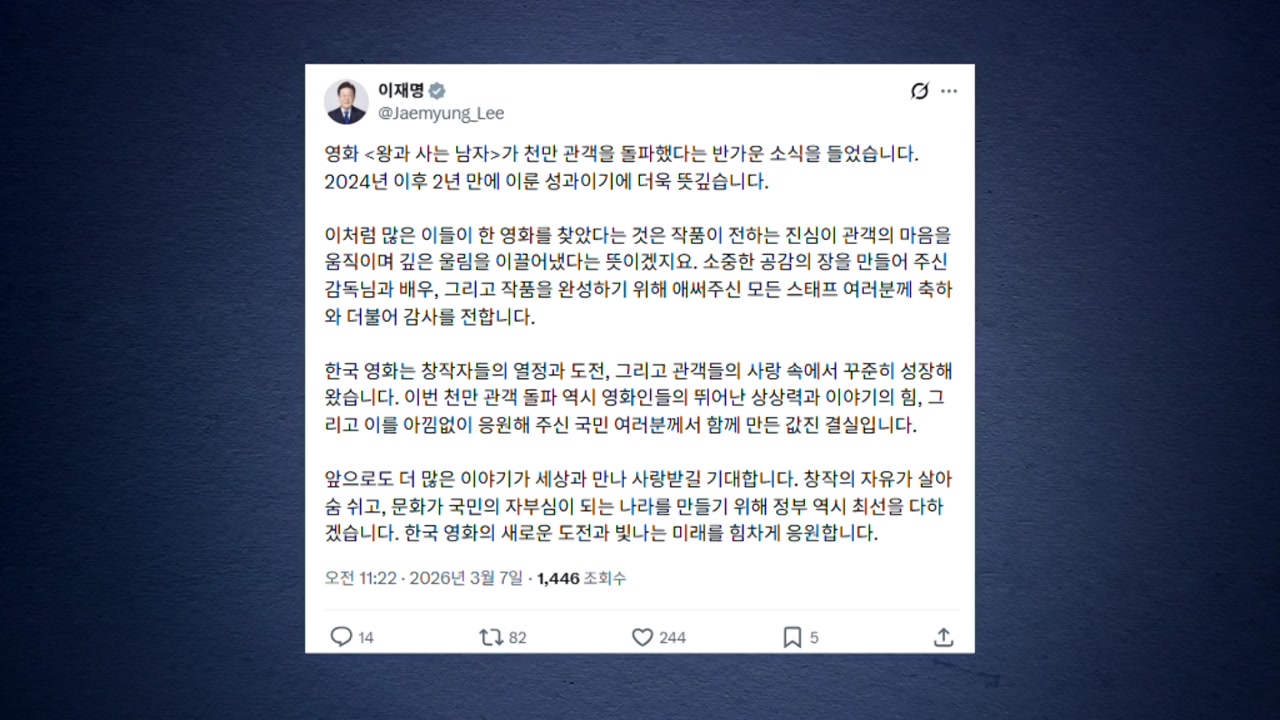 이재명 대통령은 영화 '왕과 사는 남자'의 천만 관객 돌파를 직접 축하했습니다.