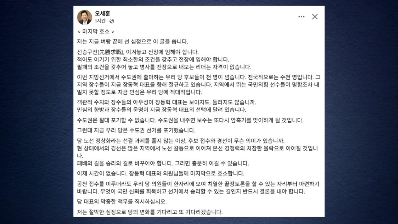 오 시장은 어제(7일) SNS에 '마지막 호소'라는 제목의 글을 통해 지방선거 출마자들이 장 대표를 향해 절규하고 있다, 명함도 못 내밀 정도로 민심이 당에 적대적이라고 밝혔습니다.