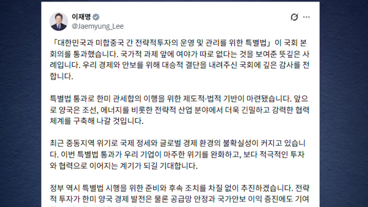 이재명 대통령은 대미투자특별법이 국회 본회의를 통과한 데 대해 깊은 감사를 전한다고 밝혔습니다.