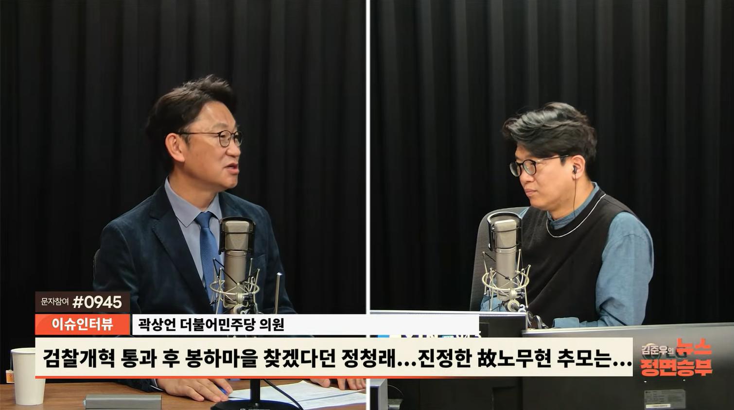 ◆ 곽상언 : 예. 제가 정청래 대표님을 상대로 쓴 것은 아니고요. 시점은 유사한 시점인데... 저는 이렇게 사람한테 뭐라고 하는 것은 그렇게 좋아하지 않습니다. 그것이 그냥 오랜 정치 행위라고 보이지도 않고요. 그런데 오랫동안 가지고 있는 생각이고, 실제로 그런 일들이 많이 벌어졌죠.