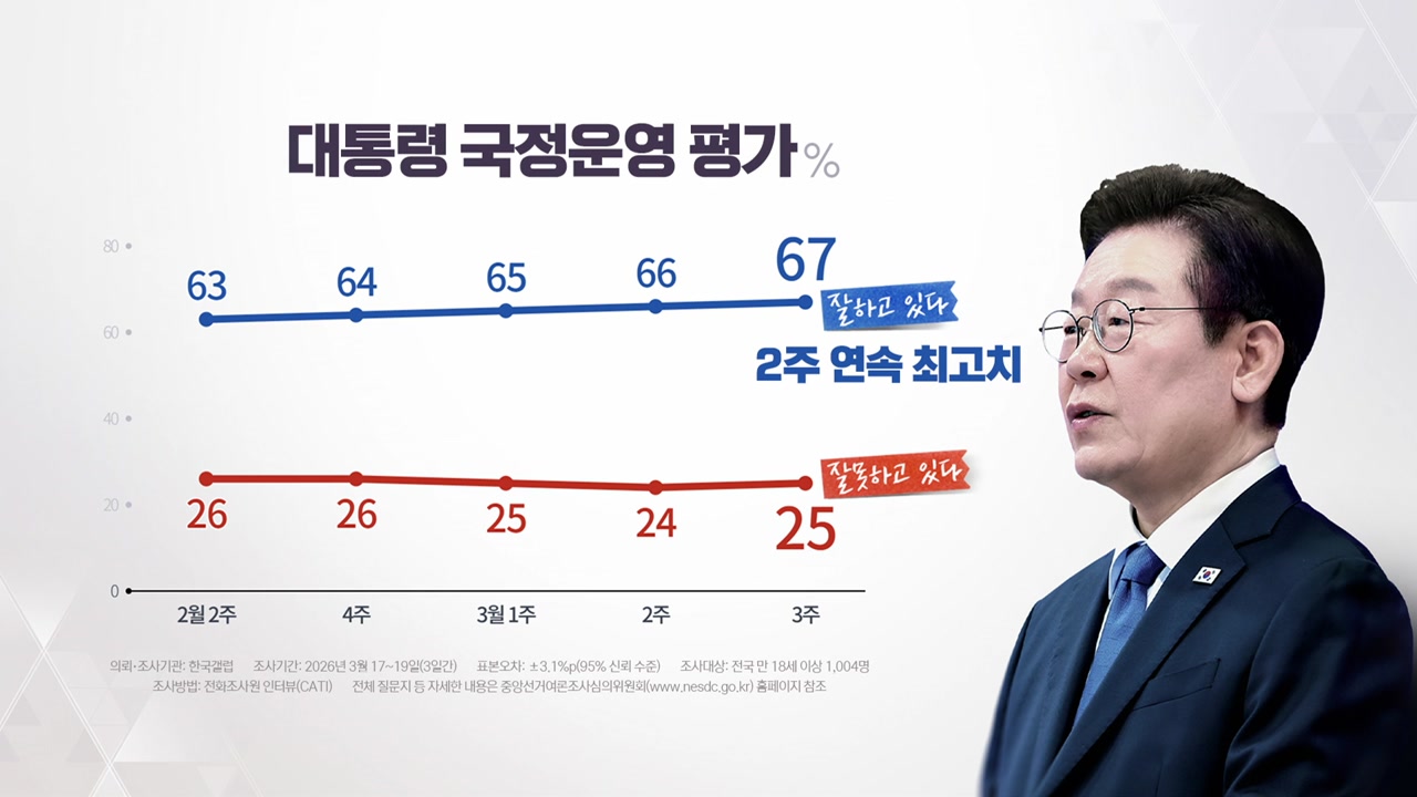 한국갤럽이 지난 17일부터 19일까지 전국 성인 남녀 천4명을 대상으로 조사한 결과, 이 대통령의 직무수행 긍정 평가는 직전 조사보다 1%포인트 오른 67%였습니다.