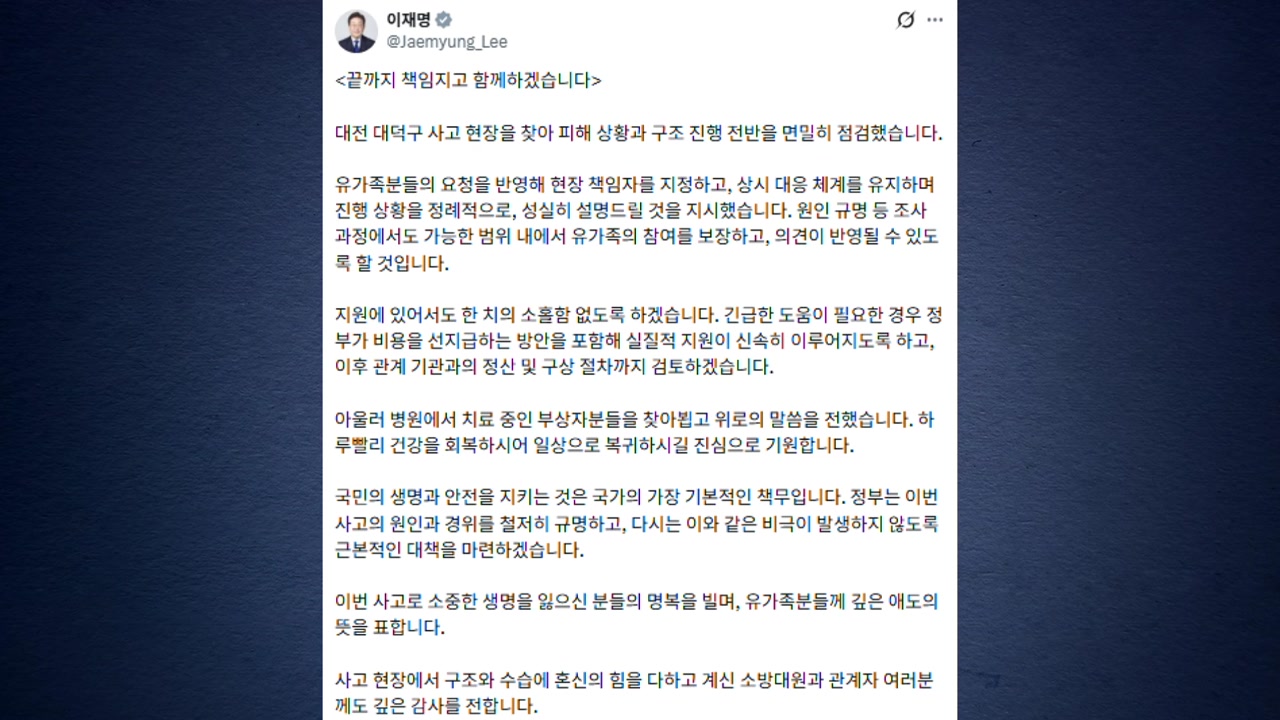 이재명 대통령은 오늘(21일) 자신의 SNS에 대전 공장 화재 참사와 관련해 이번 사고의 원인과 경위를 철저히 규명하고 다시는 이와 같은 비극이 발생하지 않도록 근본적 대책을 마련하겠다고 밝혔습니다.