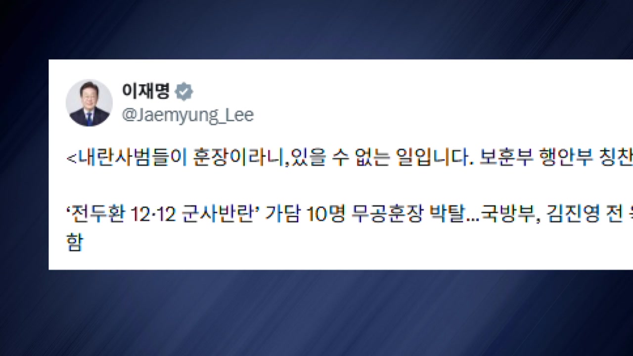이재명 대통령은 '12·12 군사 반란' 가담자들의 무공훈장이 취소된 것과 관련해, 내란 사범들에게 훈장은 있을 수 없는 일이라고 밝혔습니다.
