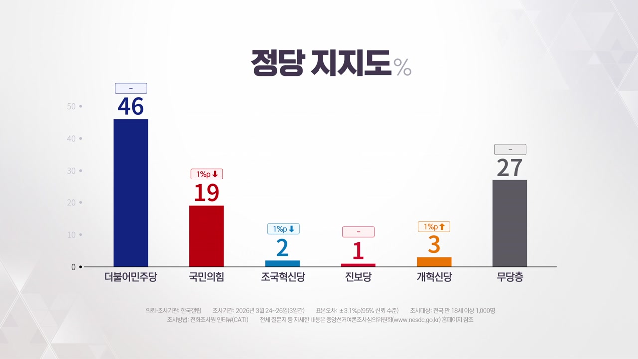 ○ 의뢰·조사기관 : 한국갤럽 ○ 조사 기간 : 2026년 3월 24~26일 (3일간) ○ 표본 오차 : ±3.1%포인트(95% 신뢰 수준) ○ 조사 대상 : 전국 만 18세 이상 1,000명 ○ 조사 방법 : 전화조사원 인터뷰(CATI) 전체 질문지 등 자세한 내용은 중앙선거여론조사심의위원회 홈페이지 참조