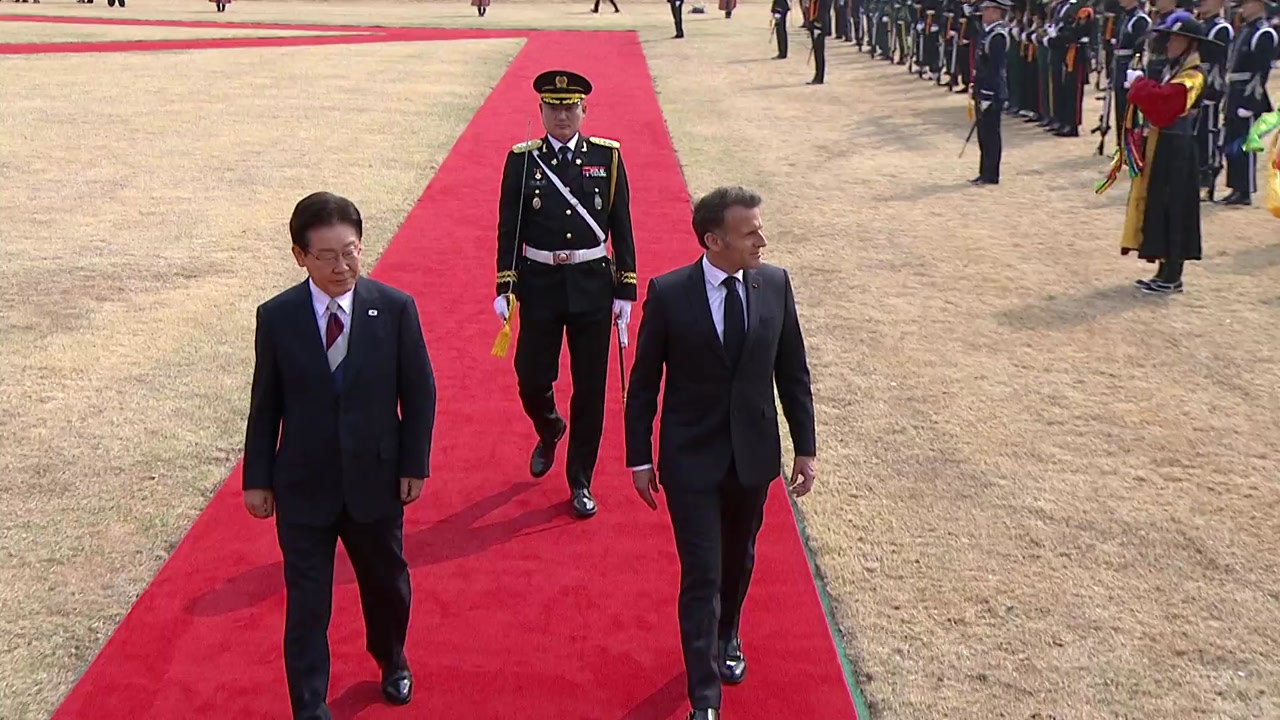 지금 취타대 등 여러 도열을 받으면서 마크롱 프랑스 대통령과 이재명 대통령이 이동을 하고 있습니다.