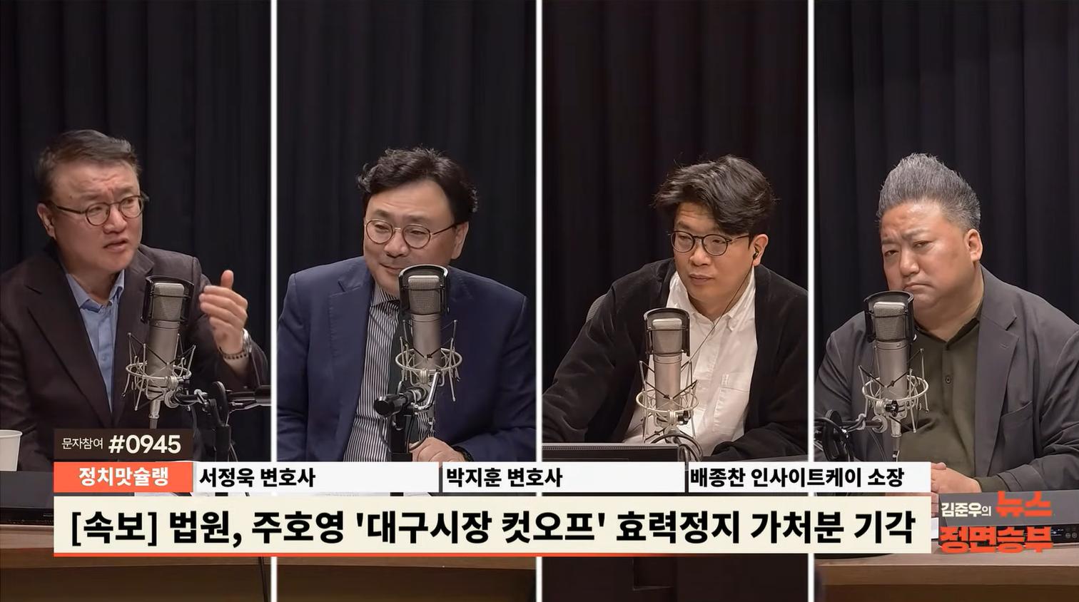 □ 박지훈 : 이례적이었고 그렇다면 주호영 재판부가 같으니까 자꾸 인용된다고 이렇게 다들 방송에서 말씀을 하시는데 그냥 다시 원점으로 돌아오면 서 변호사 계시지만 실제로 어려운 소송이거든요. 문제는 기각이 됐다 하더라도 앞으로 또 어떻게 할지 모르겠지만 국민의힘 정당에서 지금 약속했던 8인 경선을 하든지 뭘 해야 될 것 같은데 또 바뀔까 싶은 생각이 들어서 제가 불안한데요.