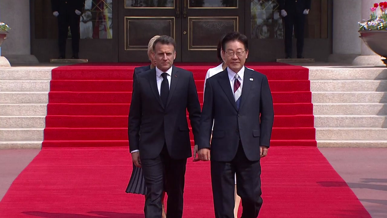 프랑스 국기를 상징하는 '삼색 넥타이'를 맨 이재명 대통령이 11년 만에 한국을 찾은 프랑스 대통령을 청와대에서 반갑게 맞이합니다.