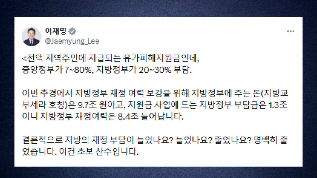 이 대통령은 오늘(5일) SNS에, 고유가 피해지원금으로 지자체 재정에 상당한 부담이 발생할 거란 취지의 보도를 공유하며 이같이 적었습니다.