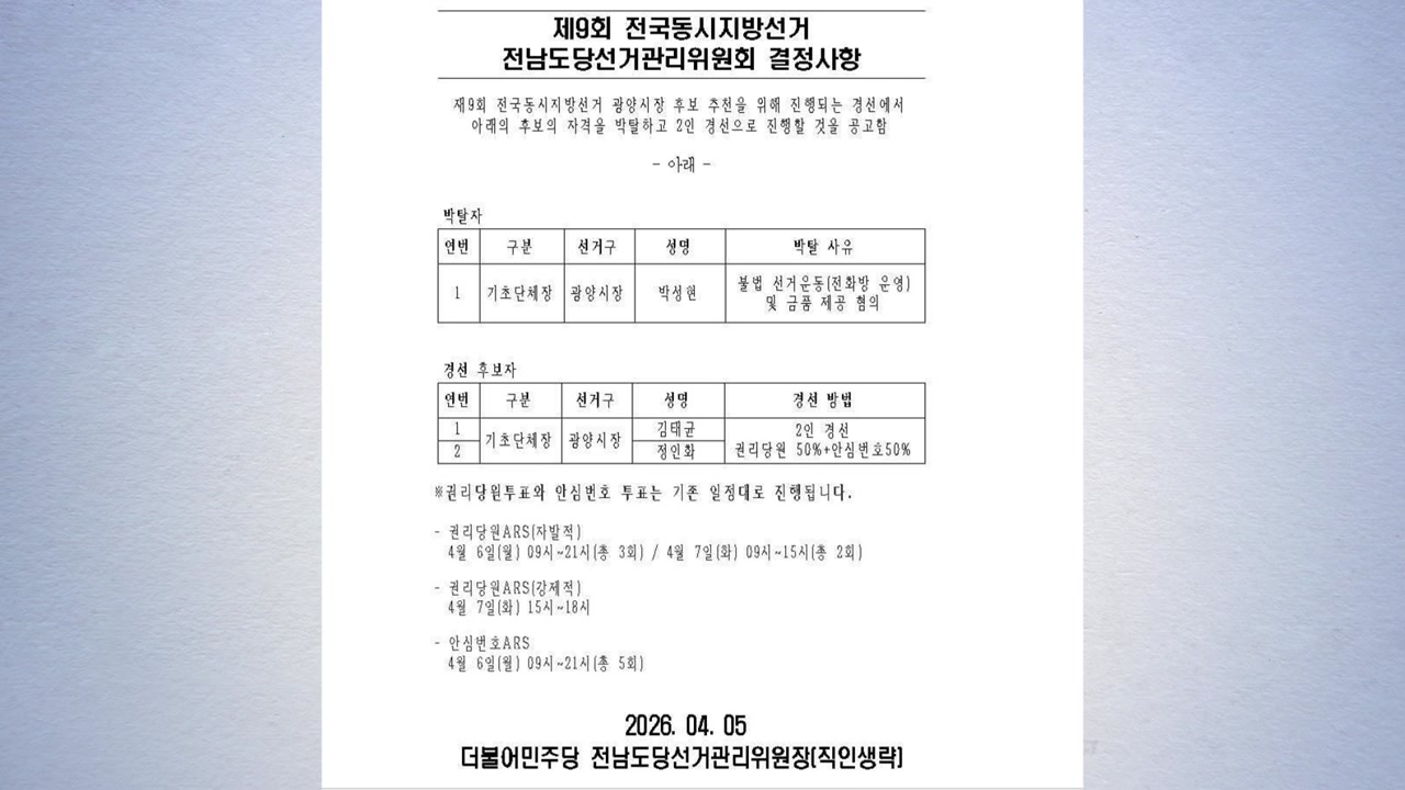 더불어민주당 전남도당선거관리위원회는 어제(5일) 공지를 통해, 불법 선거운동 의혹을 받는 박성현 광양시장 예비후보의 자격을 박탈한다고 밝혔습니다.