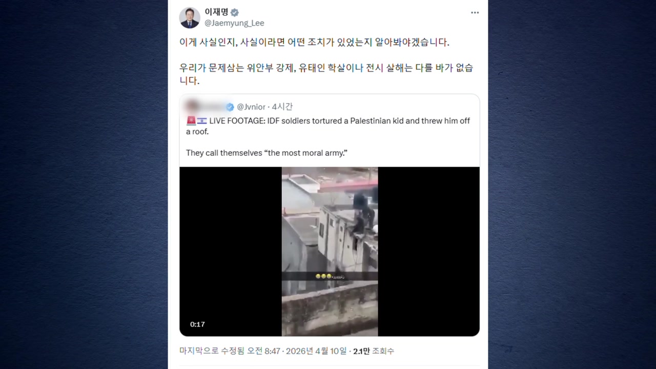 이재명 대통령이 SNS에 이스라엘군이 팔레스타인 어린이를 고문했다는 주장이 담긴 영상을 공유하며 전시 살해라고 비판했는데, 이게 논란이 됐습니다.