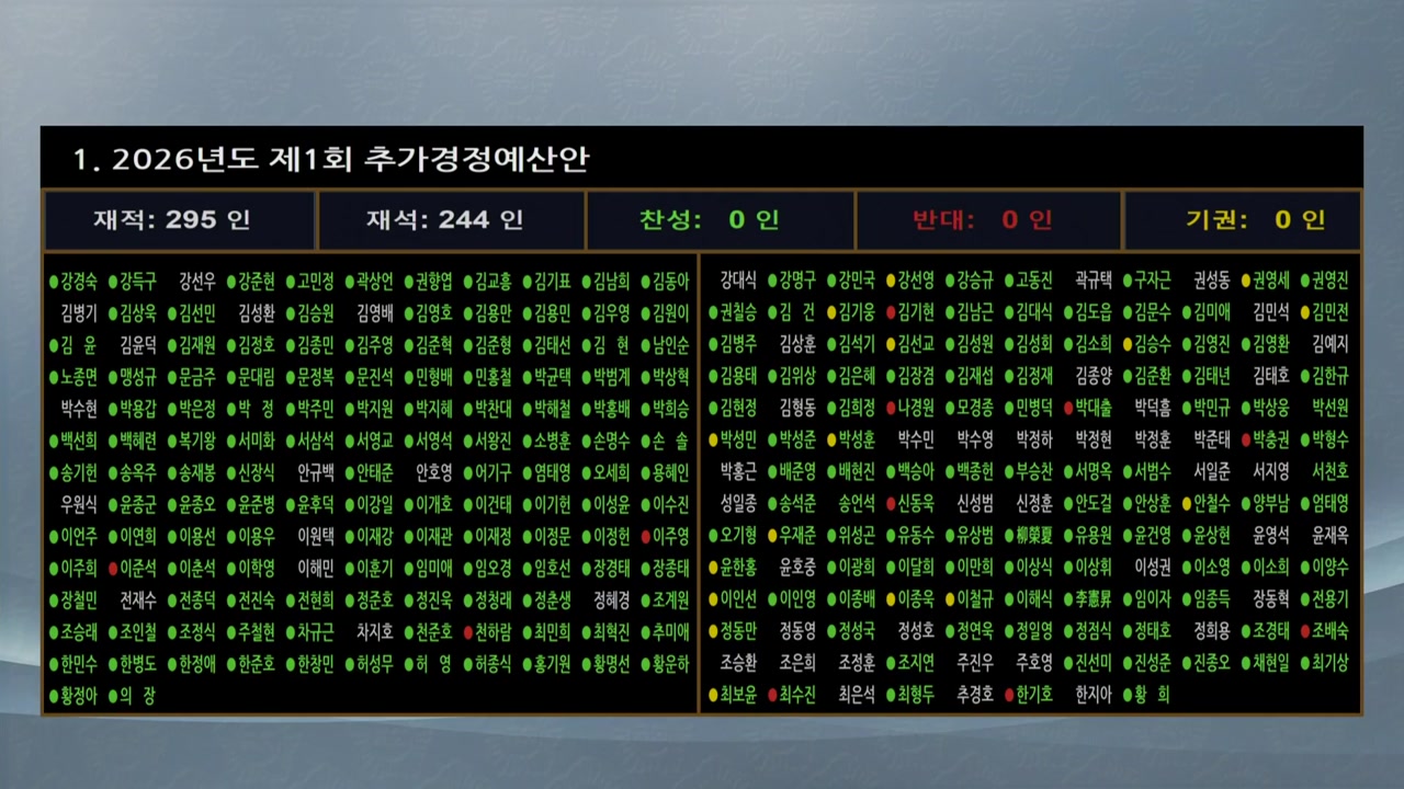 추경안은 재석 의원 244명 가운데 찬성 214명, 반대 11명, 기권 19명으로 의결됐습니다.