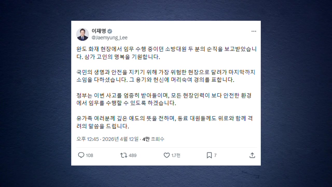 이 대통령은 오늘(12일) SNS에, 소방관 두 분은 국민의 생명과 안전을 지키기 위해 가장 위험한 현장으로 달려가 마지막까지 소임을 다했다며 이같이 적었습니다.