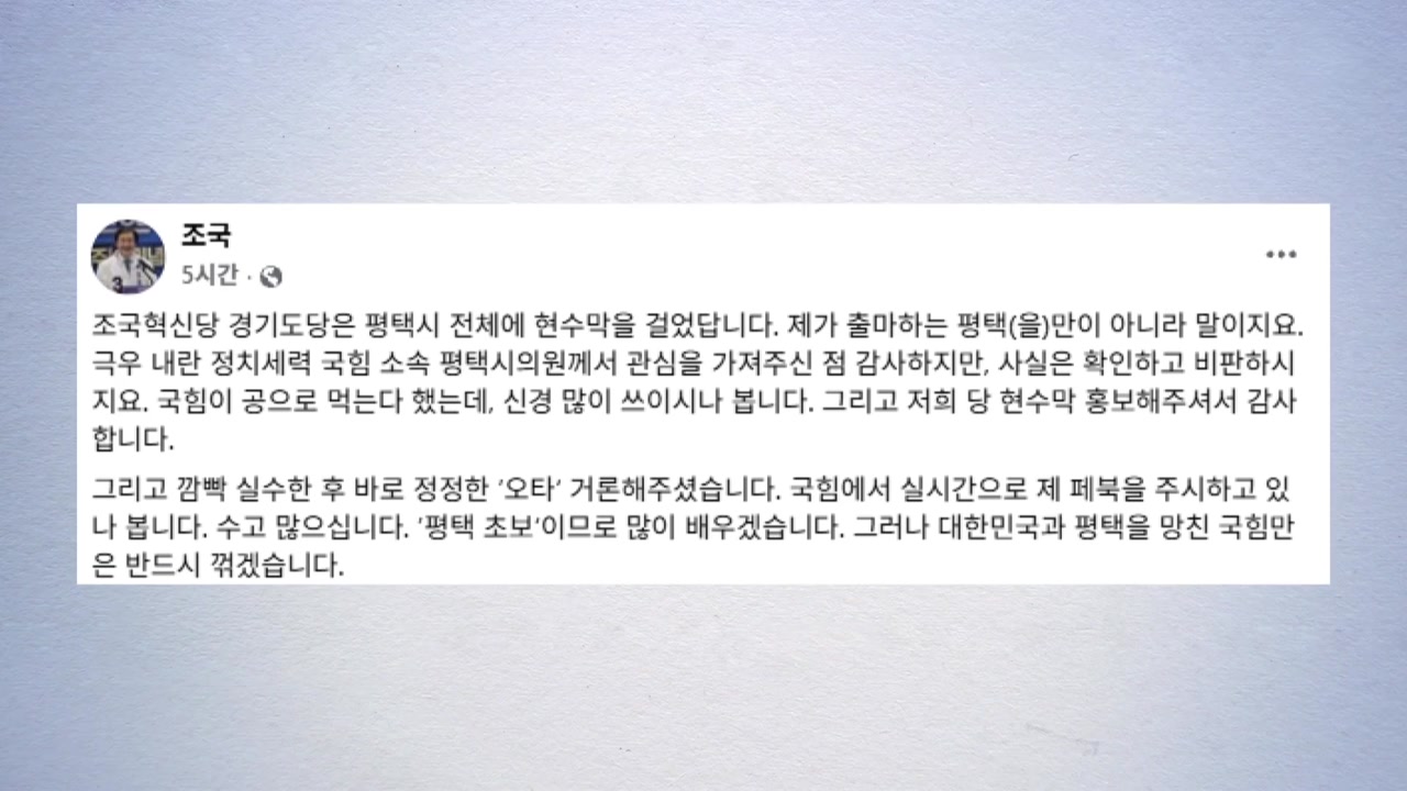 조 대표는 오늘(16일) 자신의 SNS에 깜빡 실수한 후 바로 정정한 '오타'를 국민의힘이 거론했다며, 평택 초보이니 앞으로 많이 배우겠다고 썼습니다.