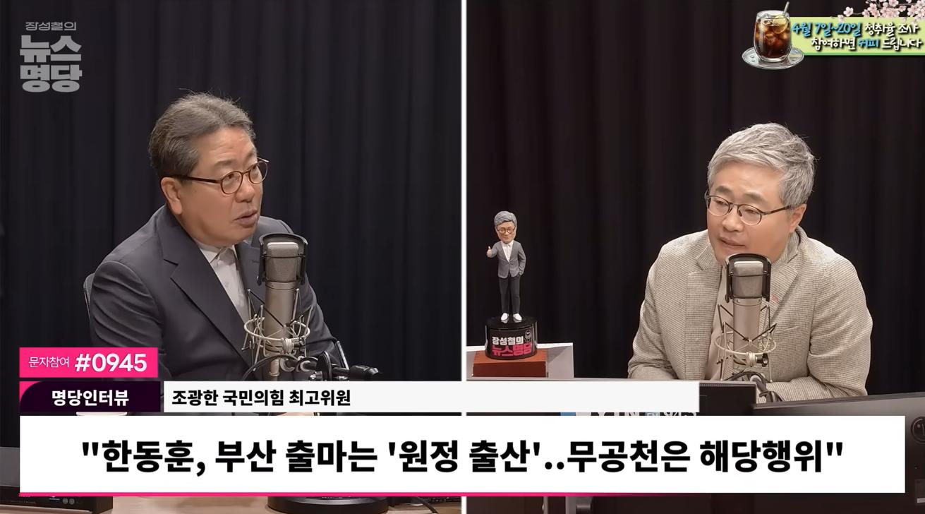 ◇ 조광한 : 아니, 그러니까 원정 출마가 조국과 한동훈 두 분을 같이 겨냥해서 한 얘기인데, 언론은 그냥 조국은 안 쓰고 한동훈을 더 쓴 거예요. 저는 조국을 더 겨냥했다고 볼 수 있는데, 두 사람이 다 난 똑같다고 봐요. 왜냐하면 제가 지금까지 정치해 왔던 이런 저의 시선으로 볼 때는 두 분의 행보가 그렇게 썩 아름다워 보이지 않고, 두 분의 발자취가 그렇게 썩 그렇게 잘나 보이지도 않아요.